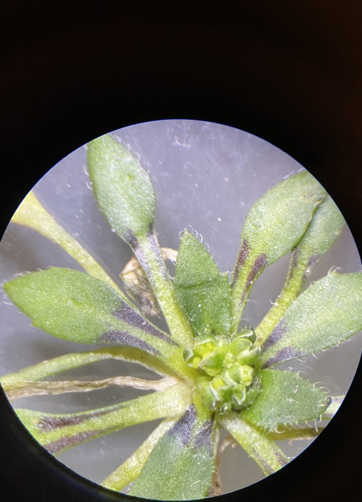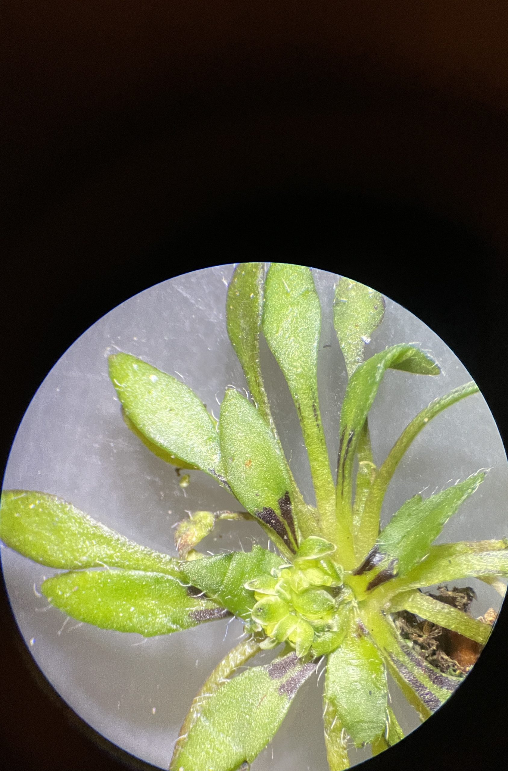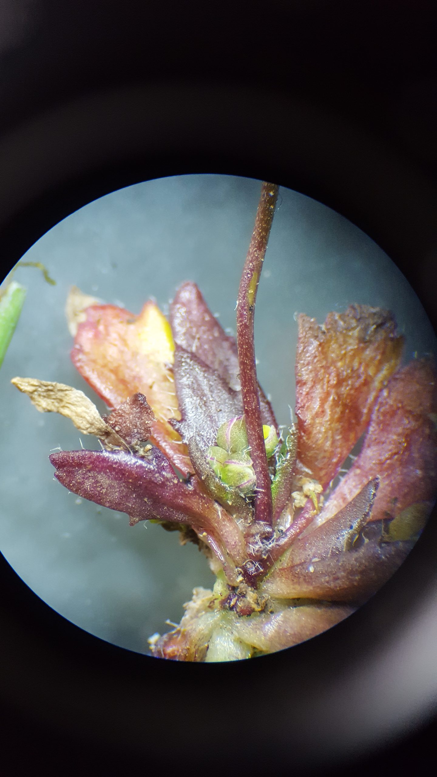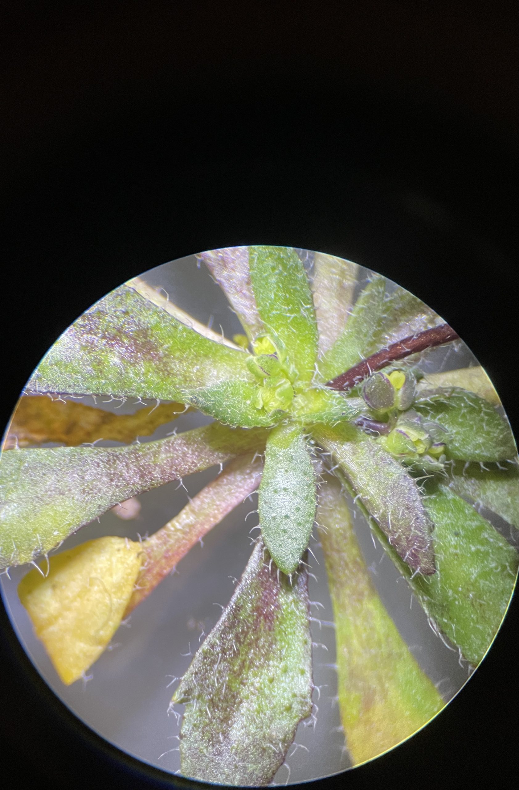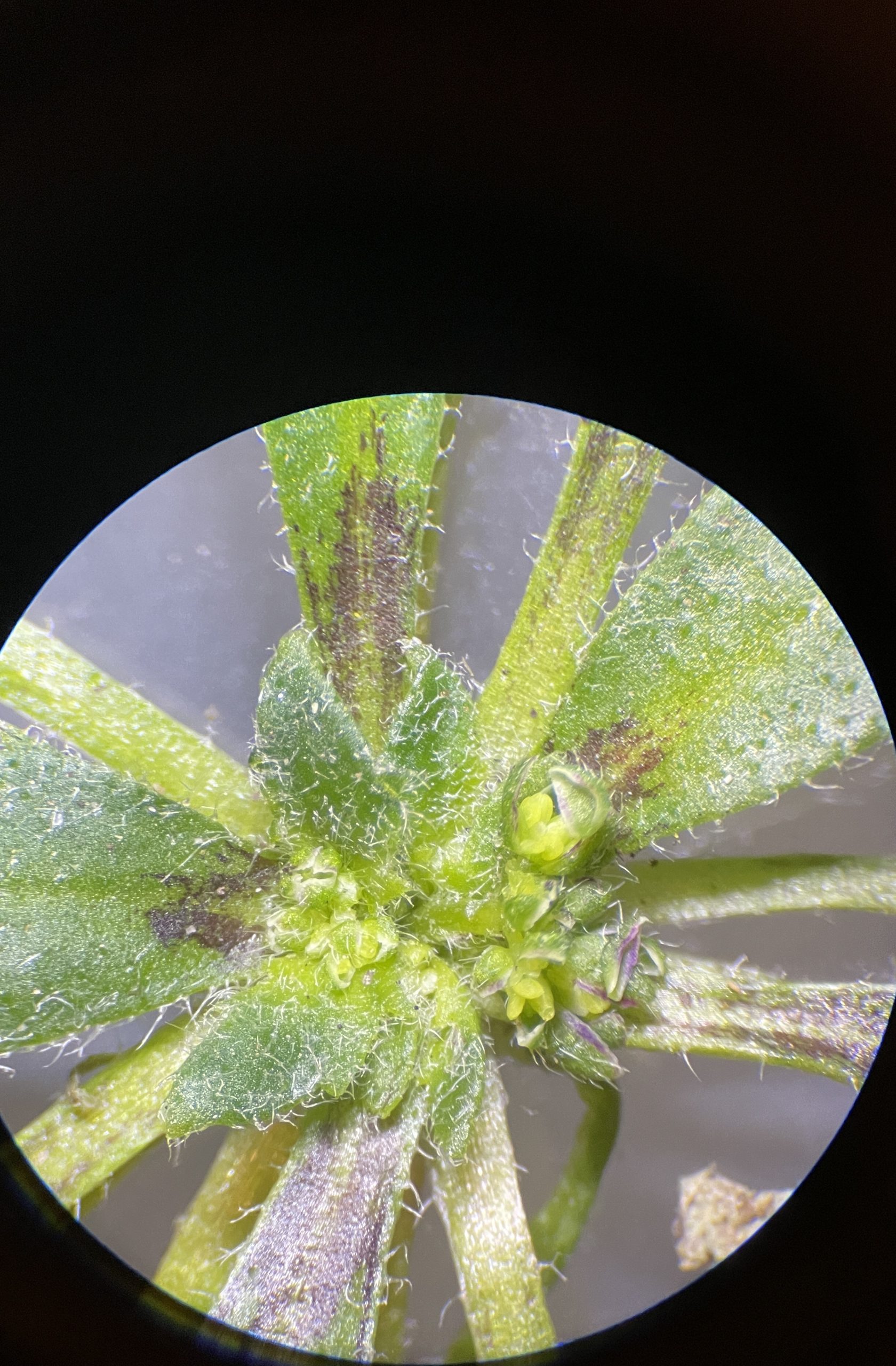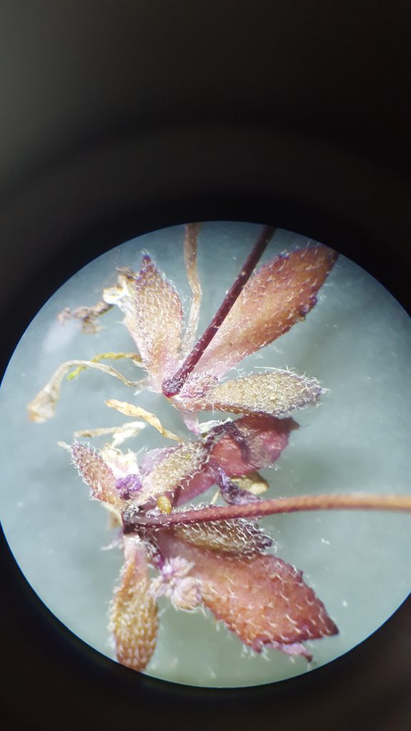 Once again, focus on the youngest leaves. No problem here finding hairs on the surfaces, and the majority are bifid; both specimens show how the swollen hair-base catches the light and gives a goose-pimple effect, such as you get in Selfheal. Both these images also show the scape on the point of elongation, and you can already see that bifid hairs are moderately frequent on the lower part.