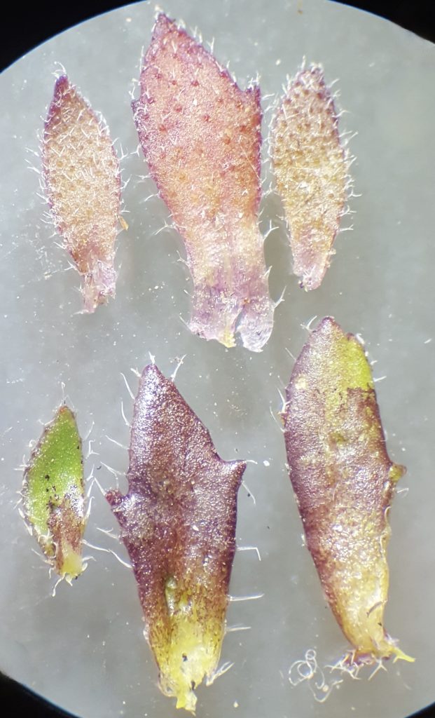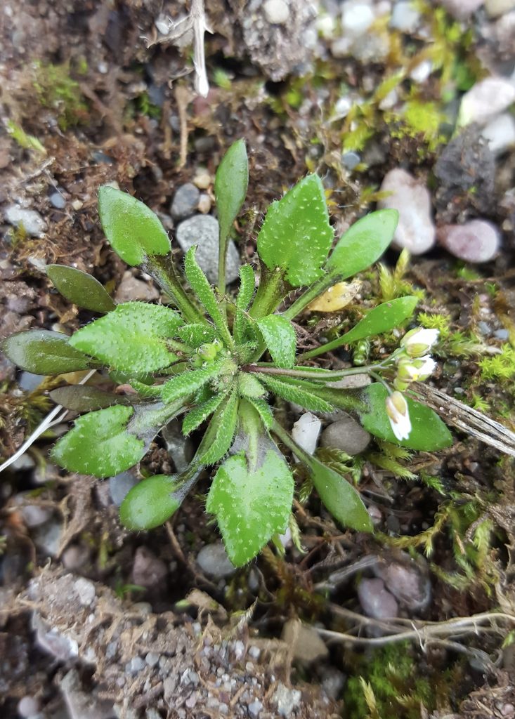 Erophila verna ss. A plant at the end of its life, but still showing clearly young (central) leaves with hairy surface, outer leaves less so but retaining pubescence. Note the leaf surface is rather matte.